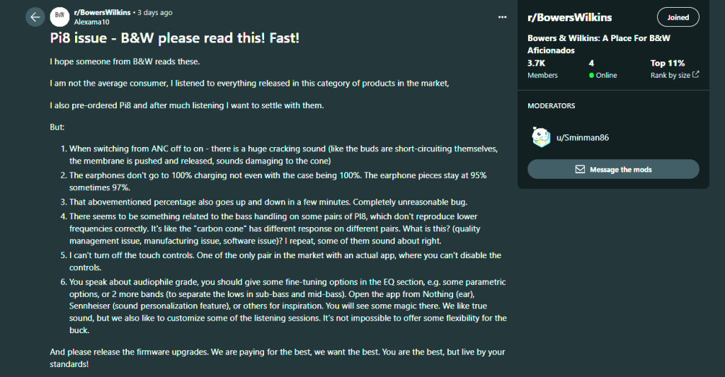 Now, normally we would say…it’s a new product and they have bugs. However, Bowers and Wilkins are not new to this game. Even upon reporting the failures B/W support team, they are responding to some consumers as they are unaware of them while others say they have reports but don’t have answers yet. But beyond that, some others have reported that they have had the same problems out of their old products. They believe that they are not competent in dealing problems they face and never handle them as was the case on every other model prior. So this has led to speculations that these problem won’t be handled by B/W this time around either.